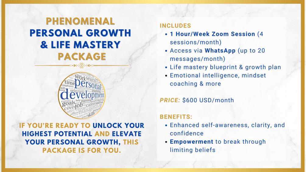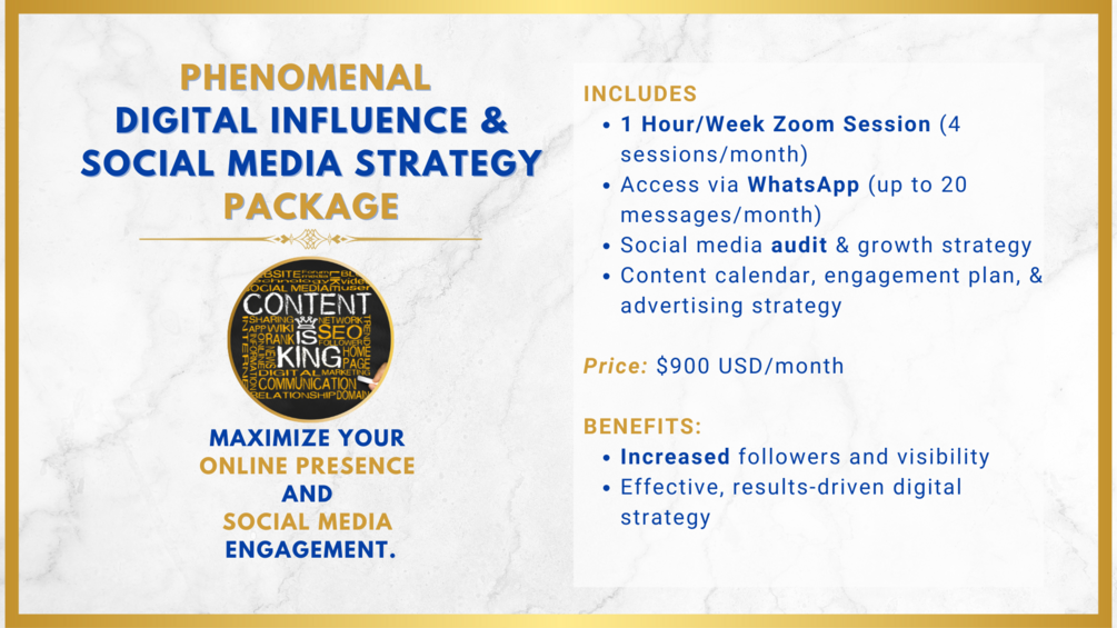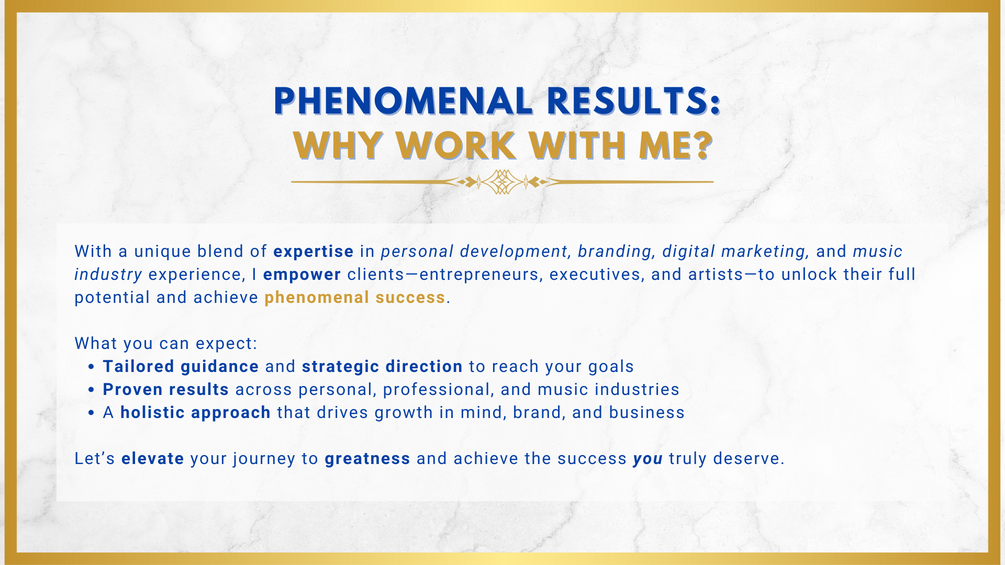 For those who want it all – personal growth, brand mastery, digital influence, and music career coaching. This all-encompassing package gives you access to every area of expertise that I offer, ensuring you excel in every aspect of your personal and professional life.