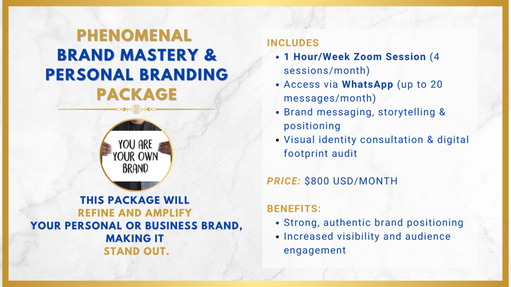 For those who want it all – personal growth, brand mastery, digital influence, and music career coaching. This all-encompassing package gives you access to every area of expertise that I offer, ensuring you excel in every aspect of your personal and professional life.